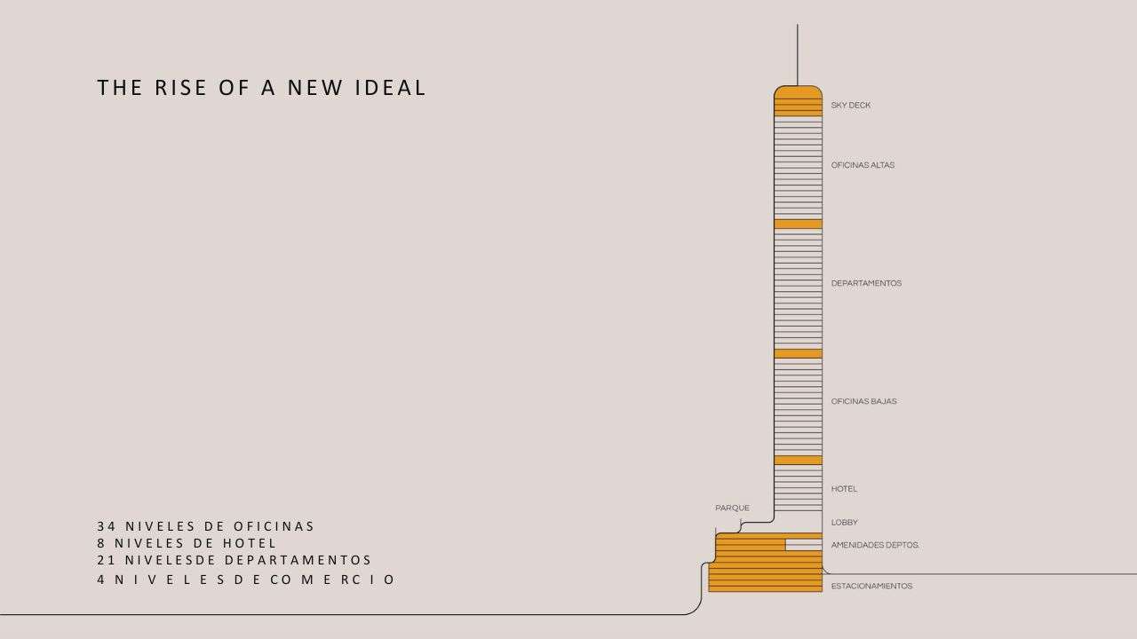 El proyecto es un complejo de usos mixtos que consta de un solo edificio, el cual contará con hotel, oficinas, departamentos y algunos restaurantes. (Solo estamos comercializando los departamentos)